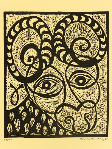 Original woodcut of a graphic, stylized ram head by artist Mercedes Guingot, 1975. Signed and dated lower right and numbered 53 of 100 lower left.