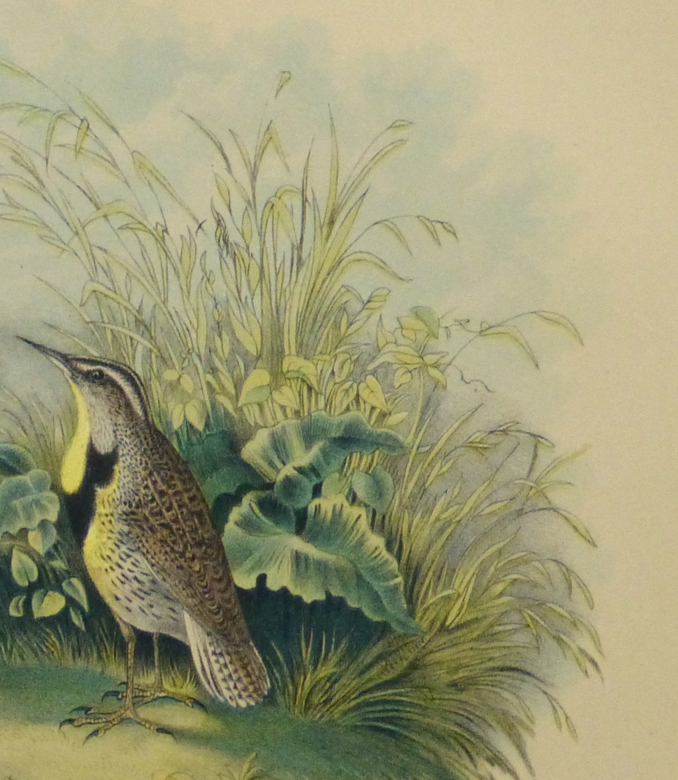 Charming color stone lithograph of two colorful meadowlarks surrounded by the countryside from Studer, 1881.