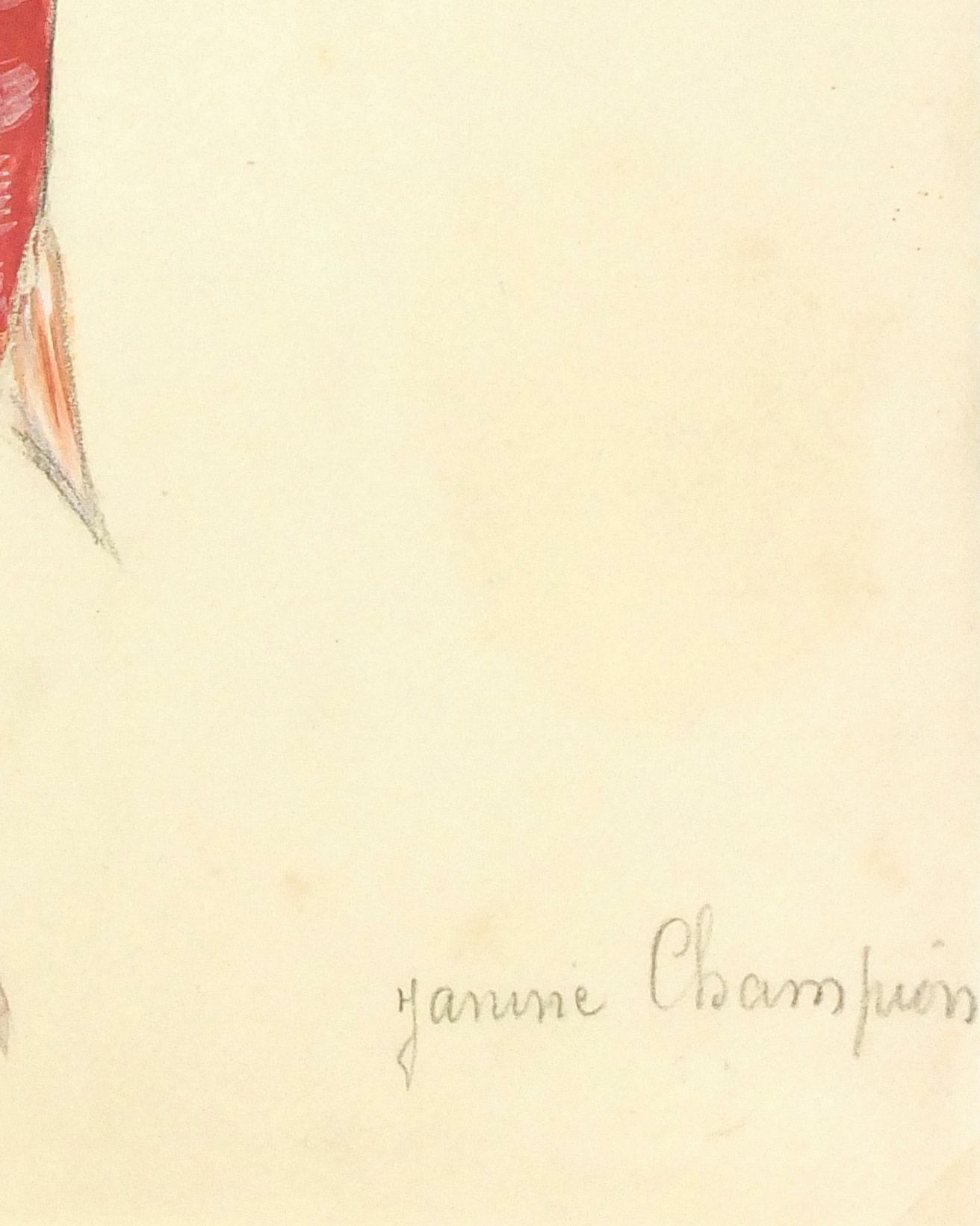 Original vintage one-of-a-kind artwork on paper displayed on a white mat with a gold border. Mat fits a standard-size frame. Archival plastic sleeve and Certificate of Authenticity included. Artwork, 9.25″L x 11.5″H; mat, 16″L x 20″H.