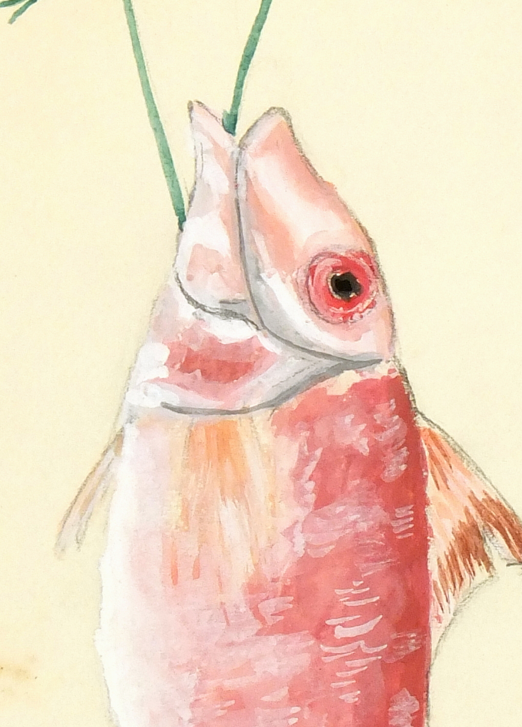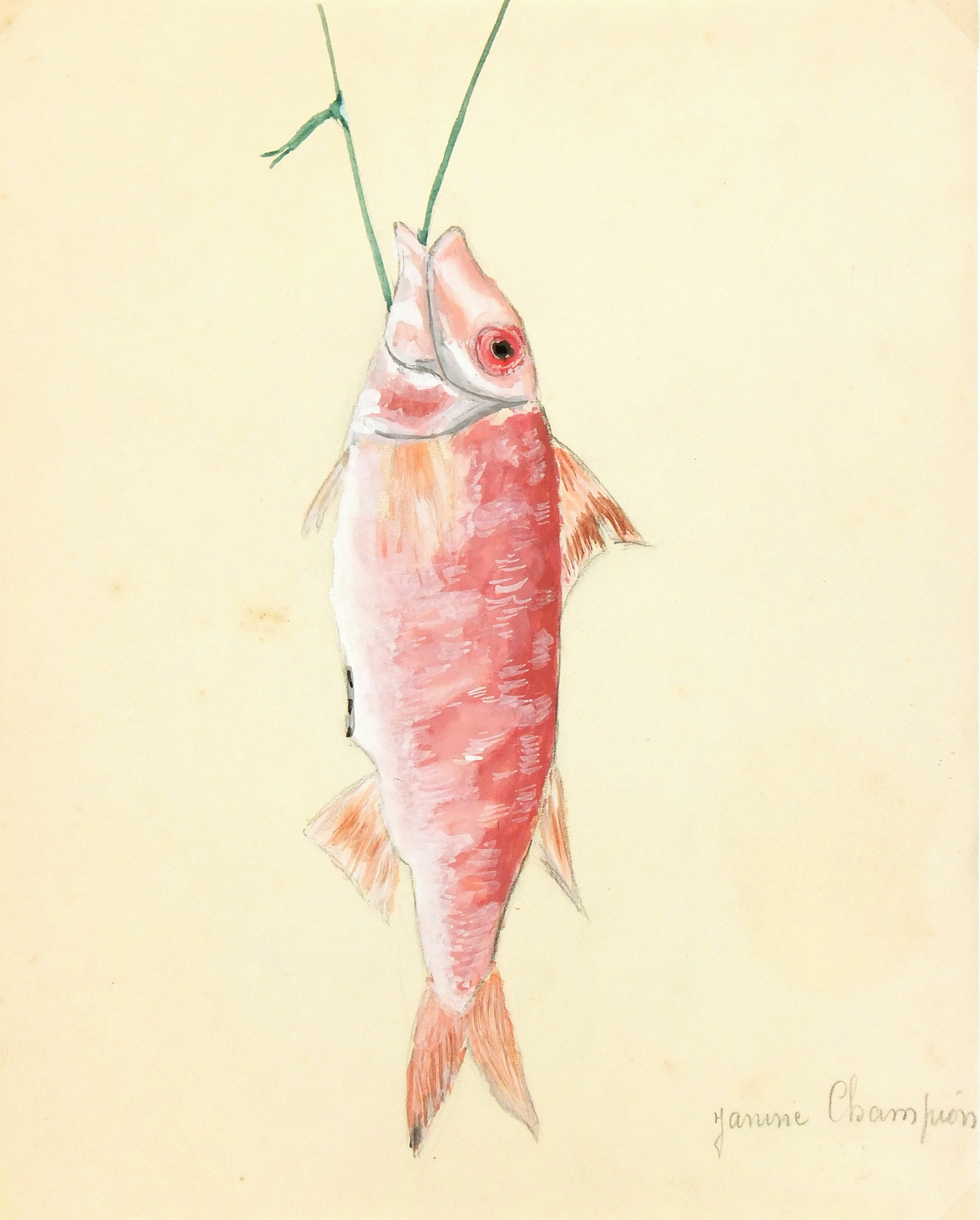 Vintage watercolor painting of a captured fish by artist Janine Champion, circa 1930. Signed lower right.