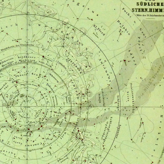 Color stone lithograph map of the Southern sky, 1873. Note chart shows illustrated constellations.