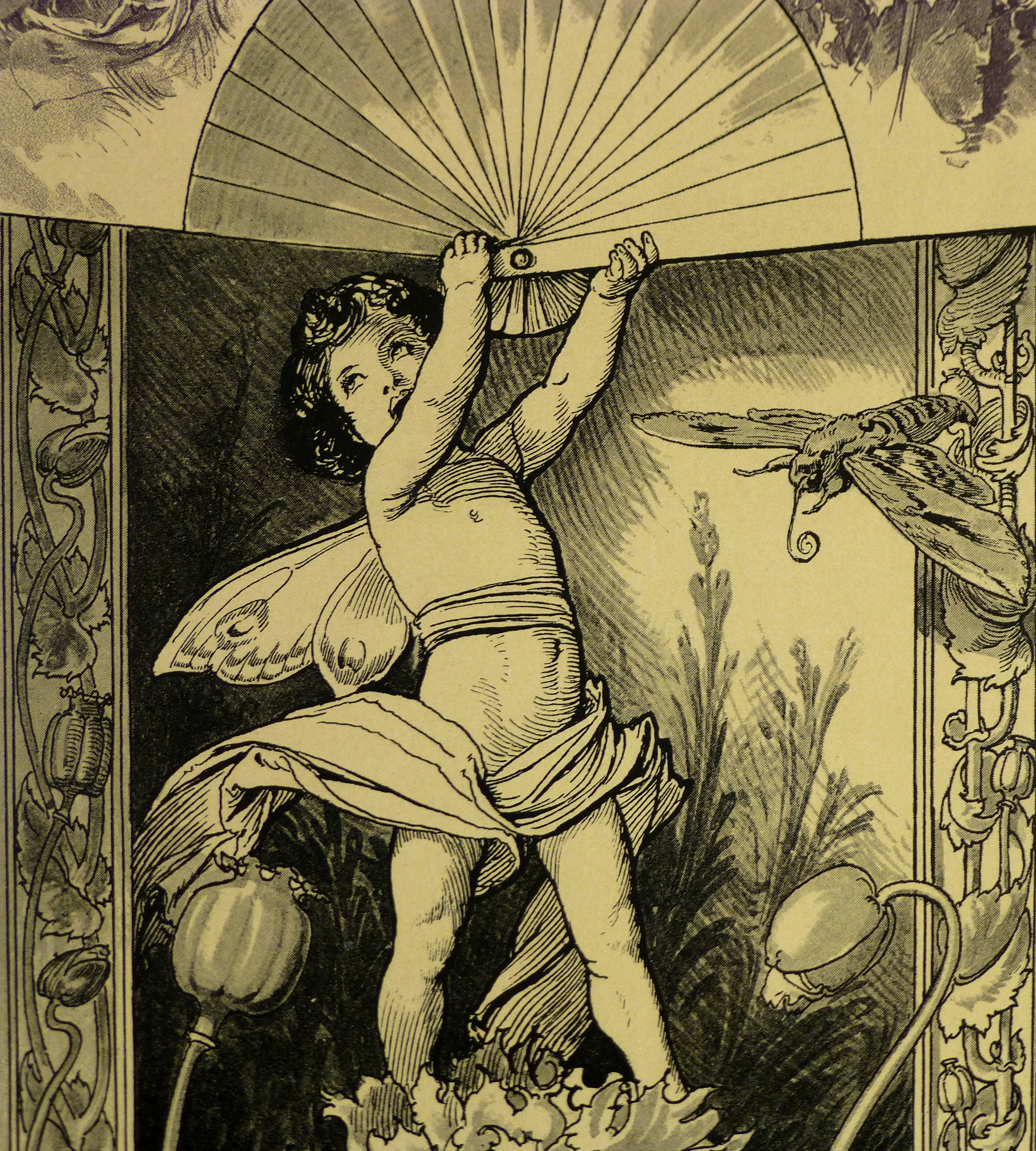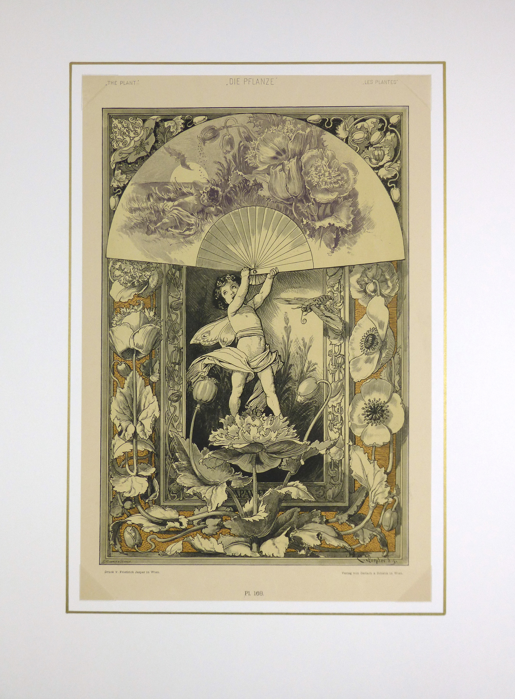 Antique color lithograph of a cherub holding a large fan and surrounded by various blossoms rendered in a flowing, organic manner characteristic of the Art Nouveau (Jugendstil) movement, 1886. Signed in plate.