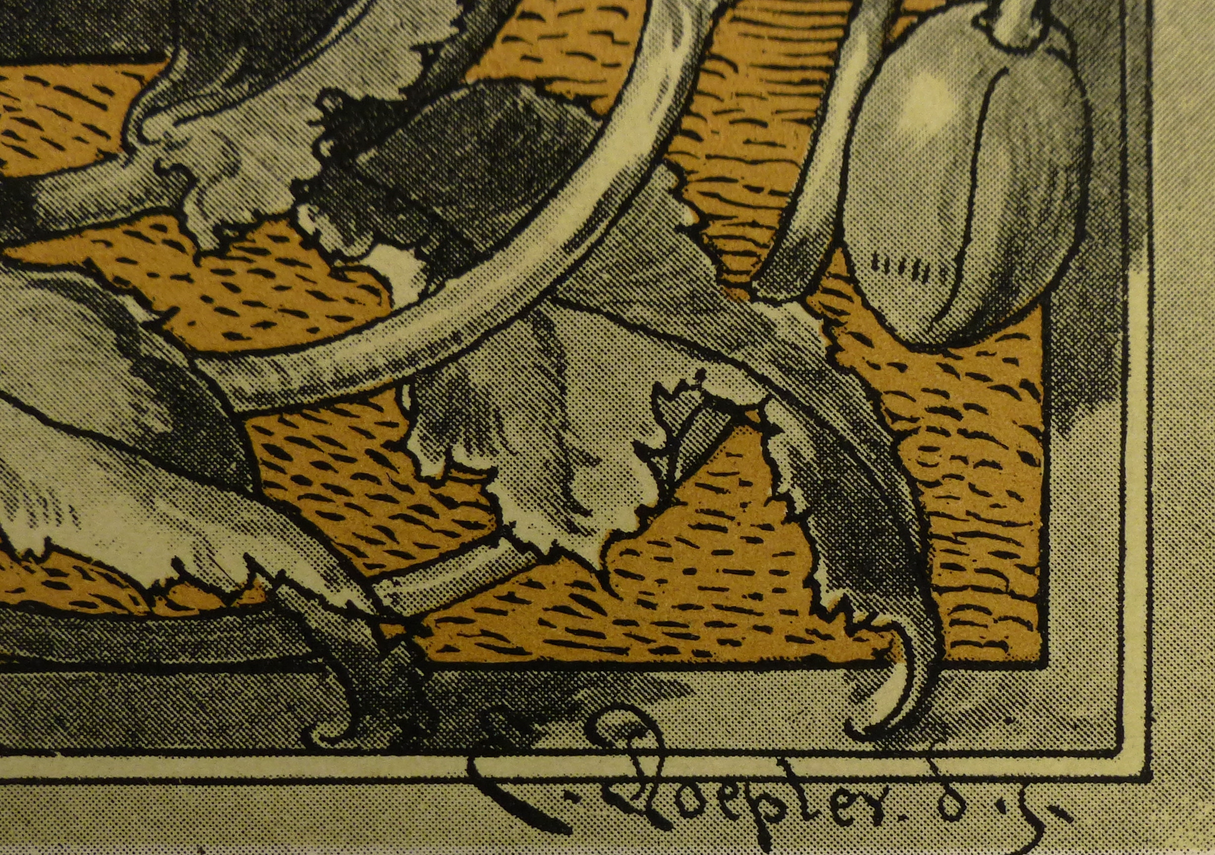 Original vintage one-of-a-kind artwork on paper displayed on a white mat with a gold border. Mat fits a standard-size frame. Archival plastic sleeve and Certificate of Authenticity included. Artwork, 11.75″L x 17.5″H; mat, 18″L x 24″H.