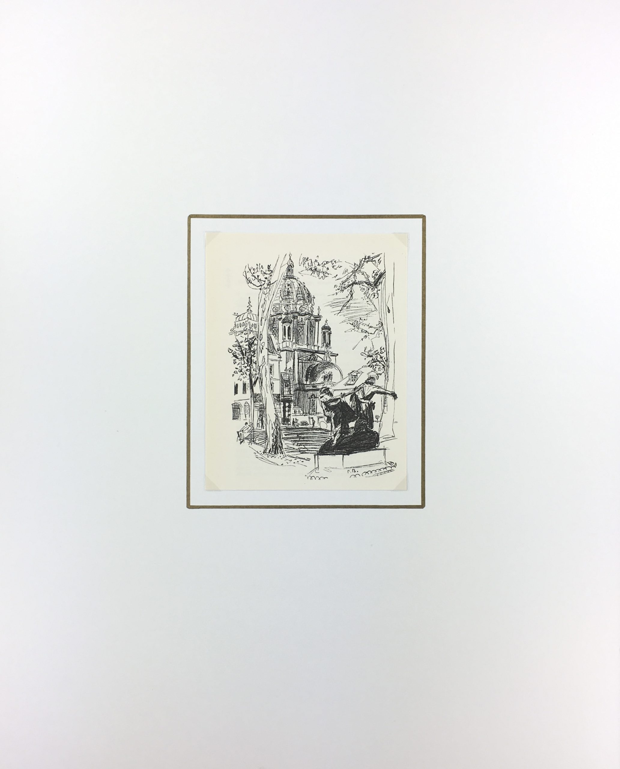 Vintage Print on paper displayed on a white mat with a gold border. Mat fits a standard-size frame. Archival plastic sleeve and Certificate of Authenticity included. Please note we may have more than one of these pieces available for sale, each one varying slightly in the tone of its paper, color tint, and overall condition. As such, the piece you receive may not match this photograph exactly. Vintage Print, 5.25″W x 6.75″H; mat, 16″W x 20″H.