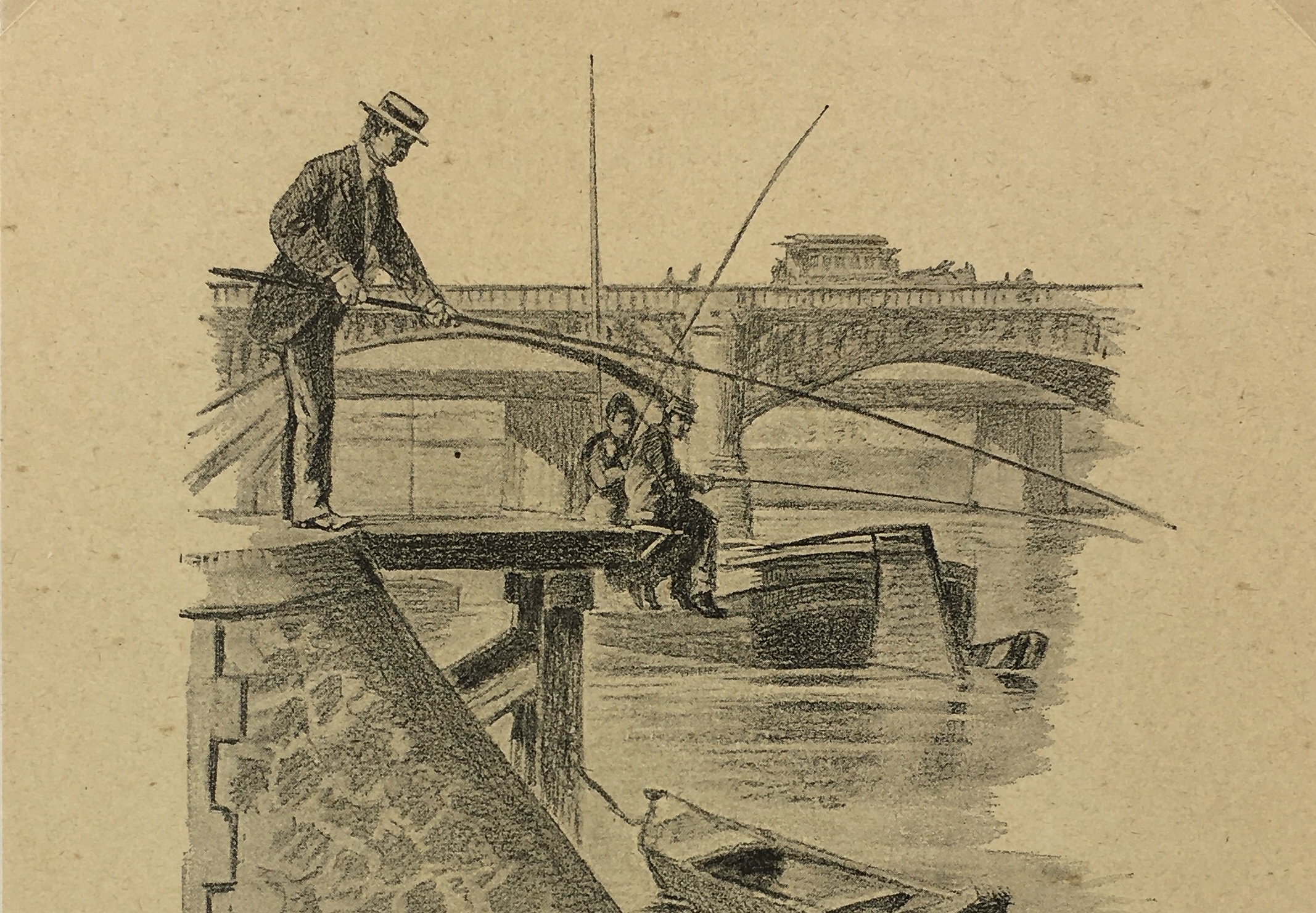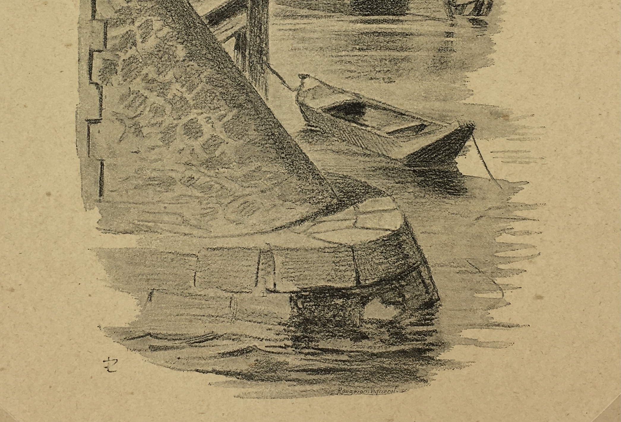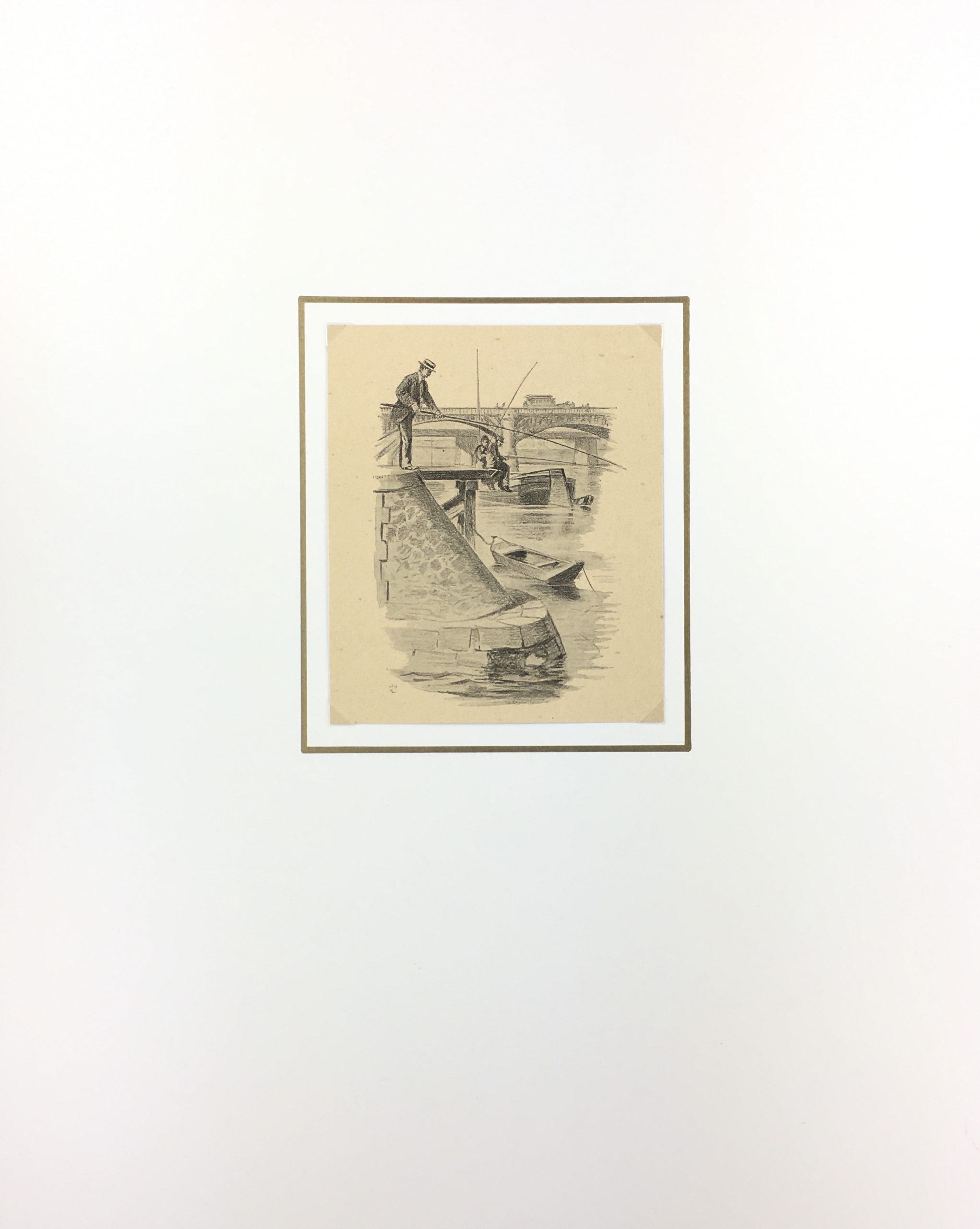 Vintage Print on paper displayed on a white mat with a gold border. Mat fits a standard-size frame. Archival plastic sleeve and Certificate of Authenticity included. Vintage Print, 5.5″W x 6.5″H; mat, 16″W x 20″H.