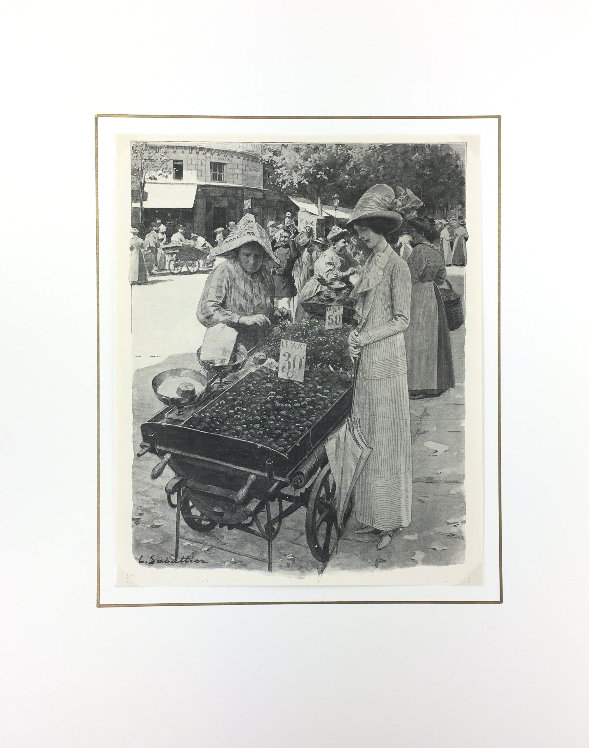 Vintage Print on paper displayed on a white mat with a gold border. Mat fits a standard-size frame. Archival plastic sleeve and Certificate of Authenticity included. Vintage Print, 9.5″W x 12″H; mat, 16″W x 20″H.