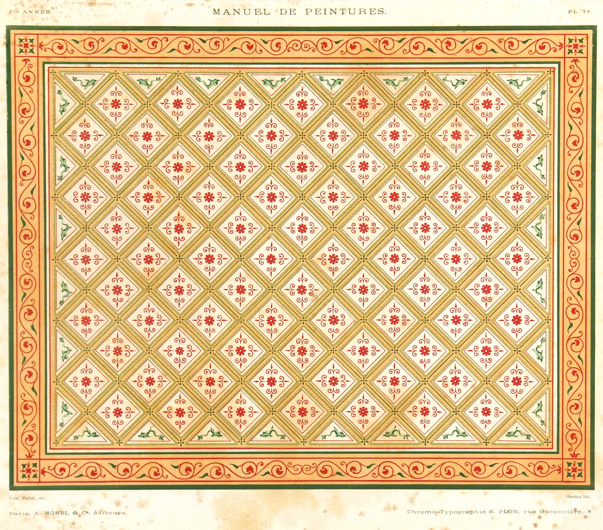 Colorful antique French chromolithograph of decorative elements for painters from Morel’s “Manuel des Peintures,” 1867.