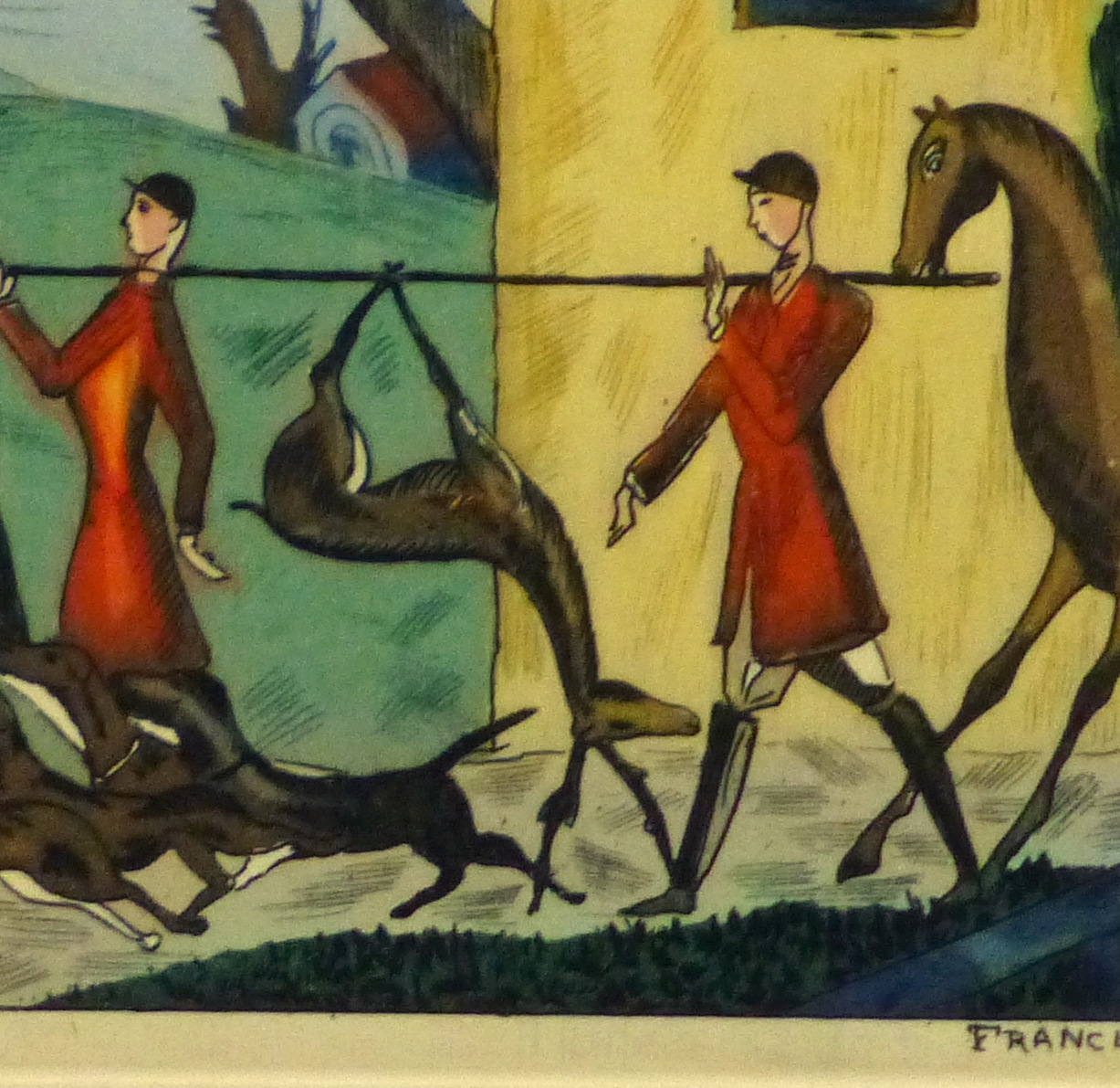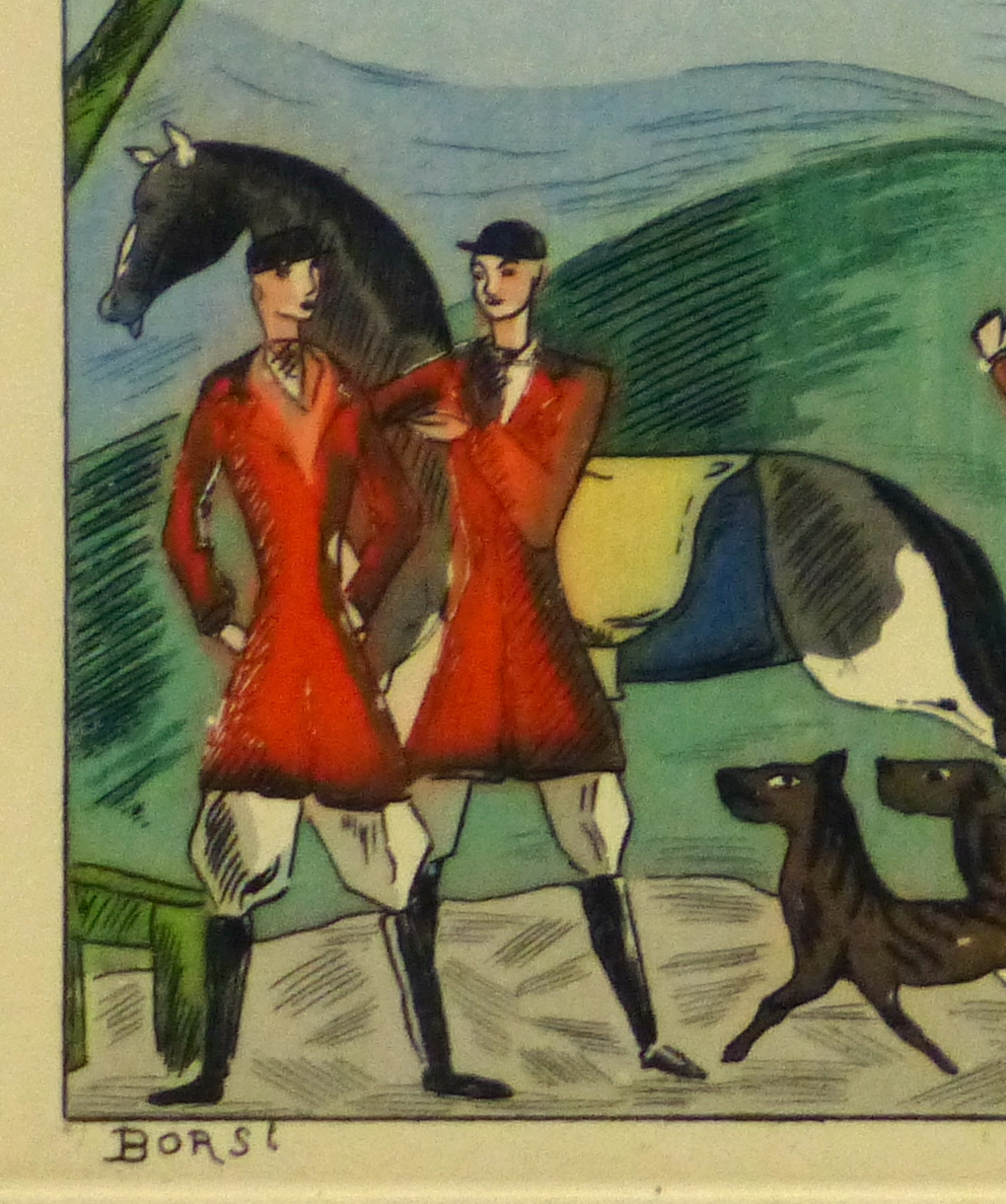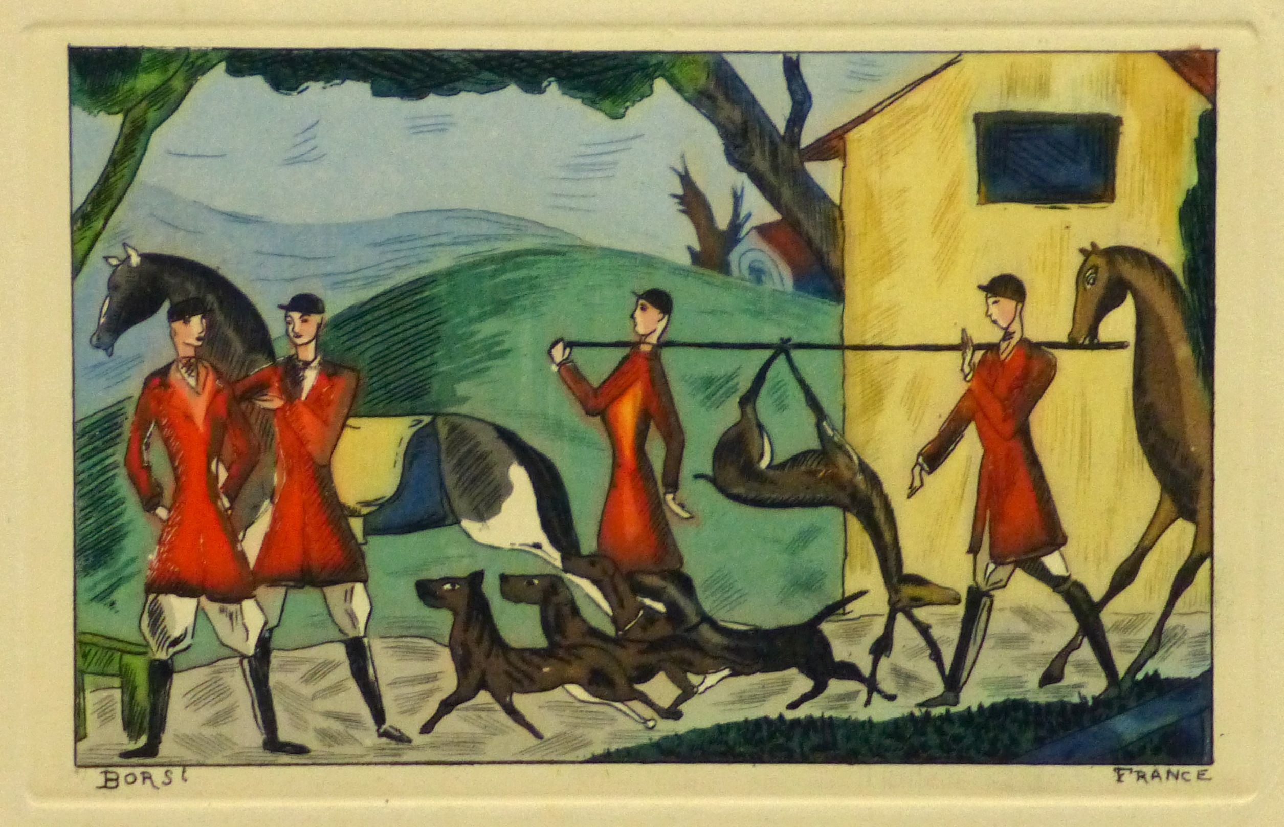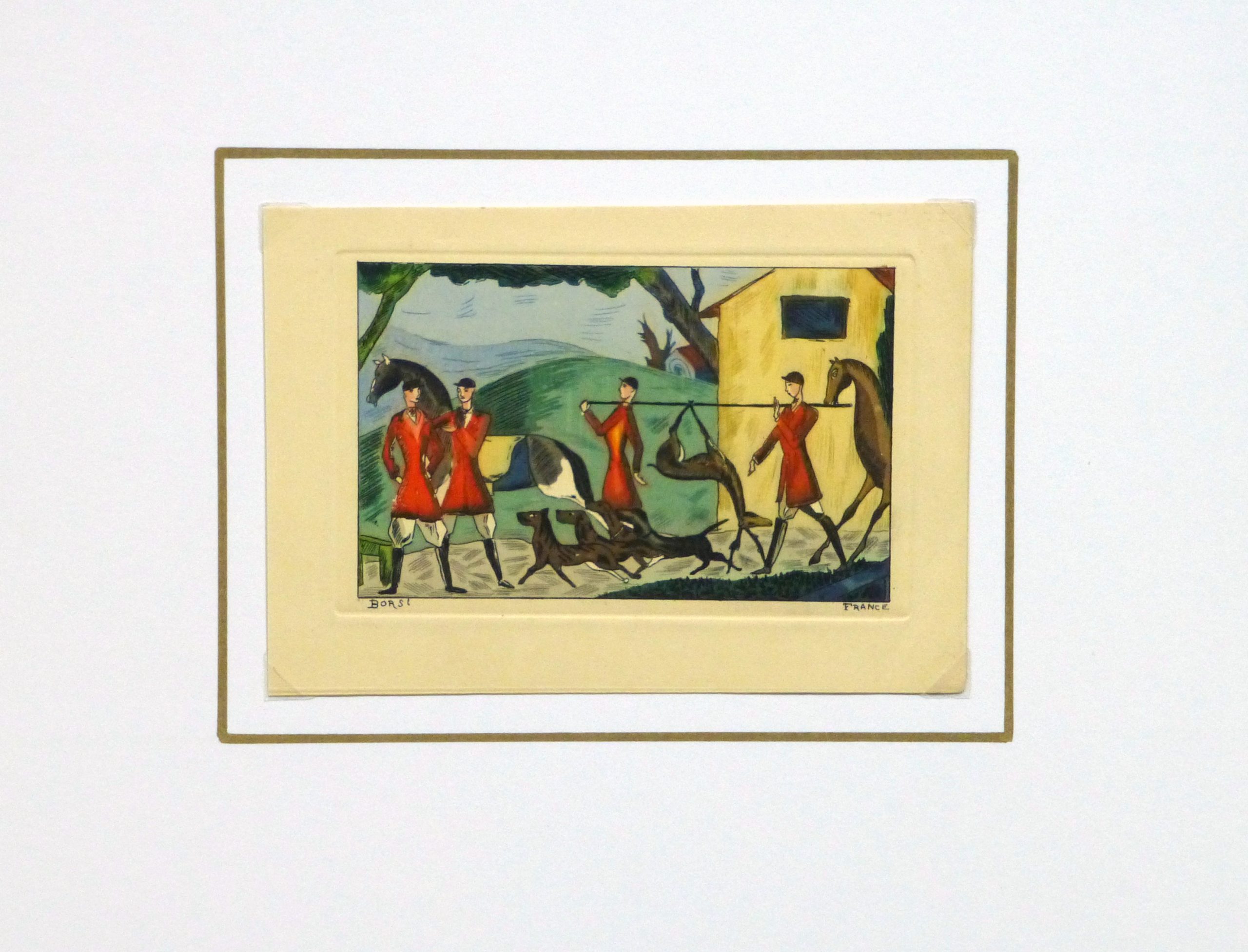 Brightly hand colored etching of a hunting party gathered after a successful outing by artist Manfredo Borsi (1900-1967), circa 1920. Signed in plate lower left.