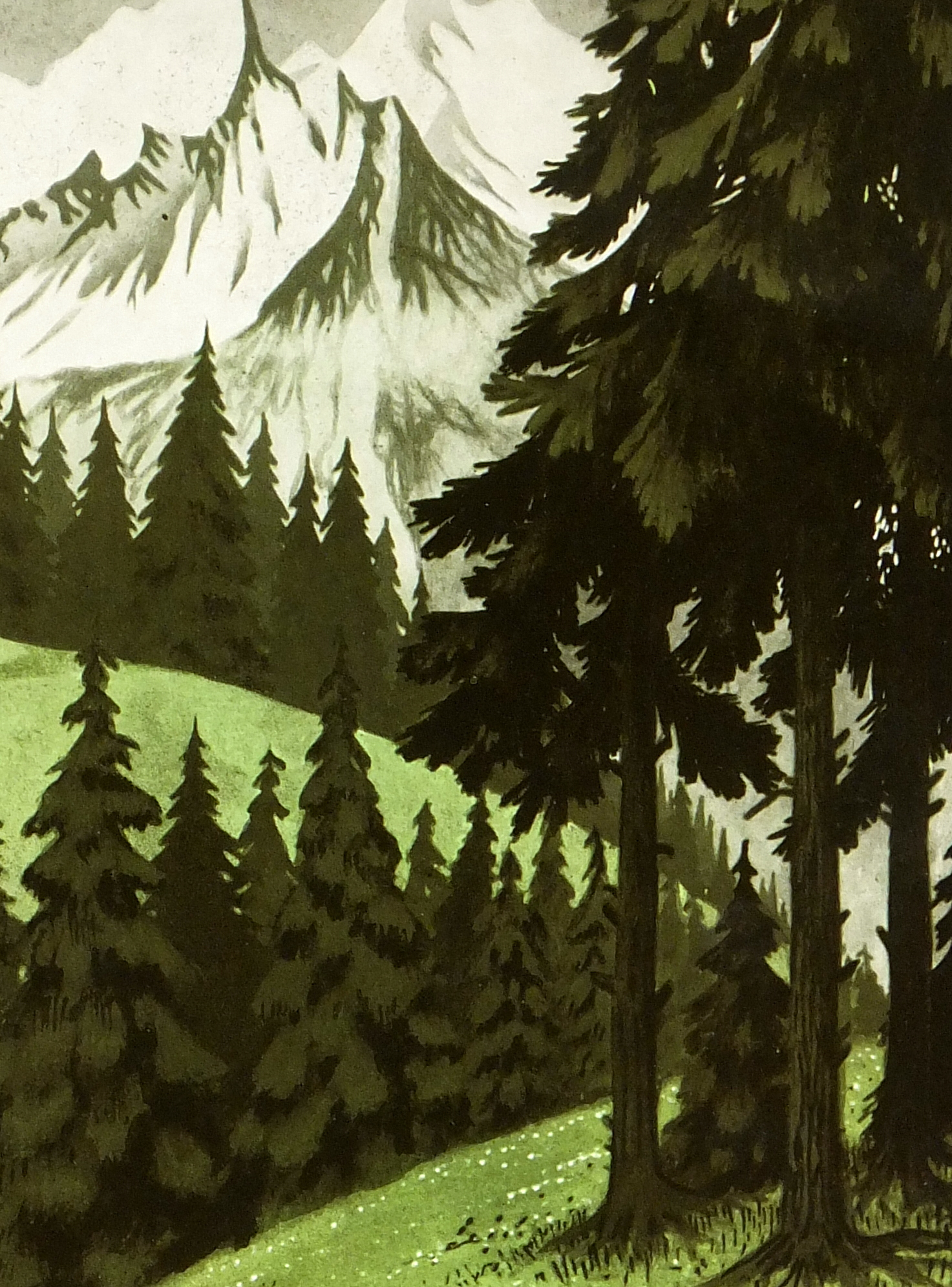 Original vintage one-of-a-kind artwork on paper displayed on a white mat with a gold border. Mat fits a standard-size frame. Archival plastic sleeve and Certificate of Authenticity included. Artwork, 10″L x 14″H; mat, 16″L x 20″H.