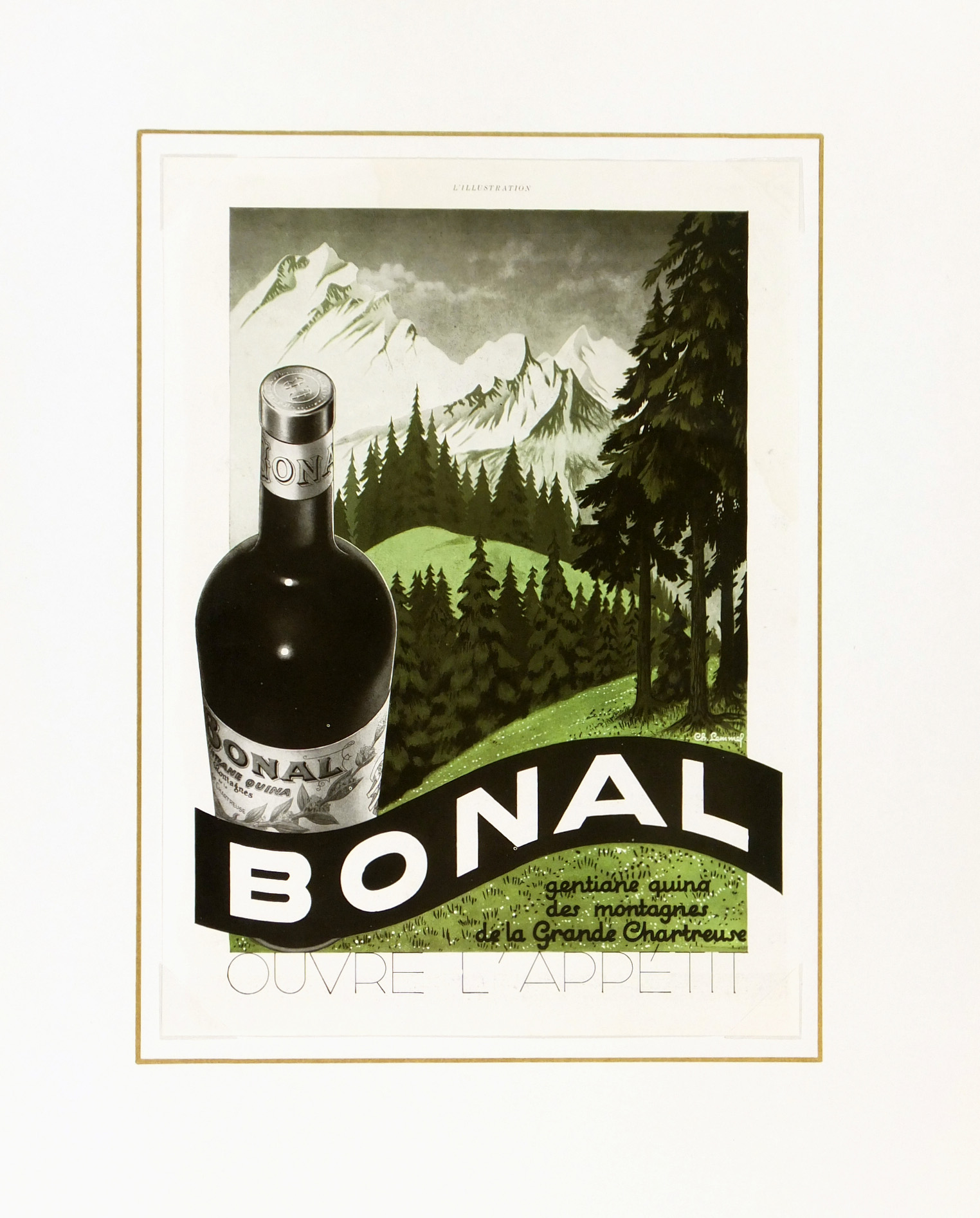Vintage offset lithograph poster for Bonal apéritif wine by artist Lemmel, circa 1930.